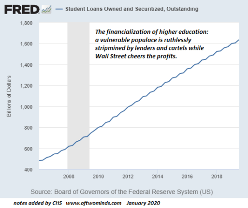 And so student loan debt has skyrocketed from near-zero to $1.6 trillion in less than a generation. This rapacious, ruthless exploitation would not have been possible without the central bank (Federal Reserve) and federal government enabling and enforcing the supremacy of private capital and the predation of the higher-education cartel.