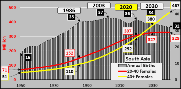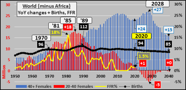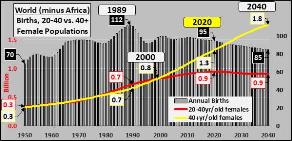 1989-’20 -17 million annual births, +230 million female 20-40year-olds, +680 million female 40+year-olds