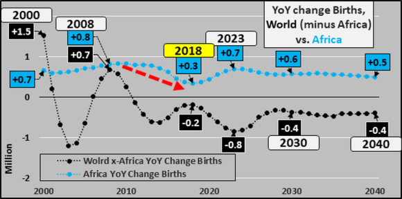 Finally, the chart below shows the year over year change in births among the world (excluding Africa) versus year over year change in Africa, from 1950 through 2040. Note the great gyrations for births among the world (black line) versus the smooth and steady year over year increases in Africa (aqua line)…except that one deceleration around 2018?!? All forward growth among births is anticipated to take place in Africa, essentially just offsetting the declining births among the remainder of the world.