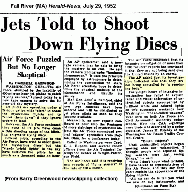 Another high-ranking official Major Donald Keyhoe alleged in an earlier 1958 interview that the Air Force was deliberately dismissing and covering up UFOs, confirming Hillenkoetter and Hynek’s claims made years later. Major Keyhoe also exposes the CIA life that all of the UFO sightings were the agency when he says that “one pilot was killed in 48 chasing one.” He also said that if they don’t exist “why do they rush to these crash sites?” A report also exists stating that the Air Force was ordered to shoot down flying saucers in 1952.