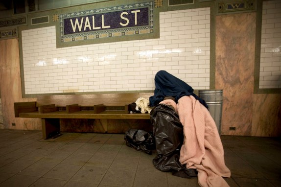 A homeless person sits under blankets at a Wall Street subway station Wednesday, May 20, 2009 in New York. (AP Photo/Mark Lennihan)