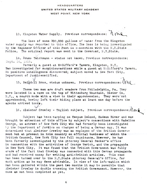 Page of the US Army Military Intelligence Division file obtained by Prof. Richard Spence that discusses Crowley’s activities in America.
