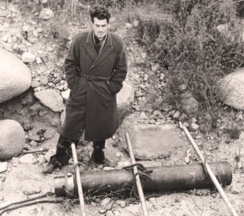 Jack Parsons standing above a canister at the Jet Propulsion Laboratory (JPL), June 1943.