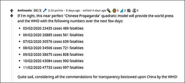 The point of this quadratic regression on Chinese infection and death numbers as reported by the World Health Organization from the first official announcement through February 4 was the publication of this projection.