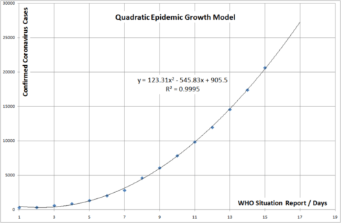 All epidemics – before they are brought under control – take the form of a green line, an exponential function of some sort. It is impossible for them to take the form of a blue line, a quadratic formula of some sort. This is what the R-0 metric of basic reproduction rate means, and if – as the WHO has been telling us from the outset – the nCov2019 R-0 is >2, then the propagation rate must be described by a pretty steep exponential curve. As the kids would say, it’s just math.