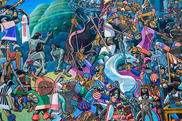 Street art illustrating what the Spanish conquistadores did to the Inca during their conquest and the Battle of Cajamarca.