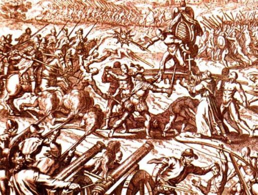 – “…Vicente de Valverde, a friar traveling with the expedition, demanded Atahualpa convert to Catholicism, and to acknowledge the Spanish king as his sovereign…The Sapa Inca replied that he would be “no man’s tributary” and threw the Bible…to the ground. This was the moment the Spanish had been waiting for to spring their trap….The weapons and horses of the Spanish added to the initial shock of the surprise attack…According to one estimate, in the course of two hours, more than 4,000 Incas were killed by Pizarro and his men. Pizarro, on the contrary, did not lose a single man”