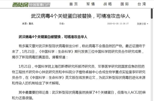 有多篇文章对武汉新型冠状病毒做出分析,称此病毒不会是自然的产物。最近证据终于来了,1月21日,《中国科学:生命科学》期刊发表三位中国科学院研究员合作研究成果,揭示了新冠病毒的真面目。请看报道: