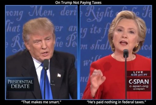 Or maybe he doesn’t want the American people, all of you watching tonight, to know that he’s paid nothing in federal taxes because the only years that anybody has ever seen were a couple of years when he had to turn them over to state authorities when he was trying to get a casino license and they showed he didn’t pay any federal income tax…