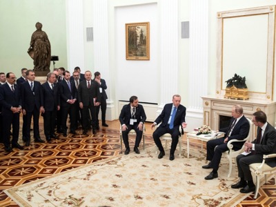 With keen pleasure, the Kremlin has staged the surrender of Turkey: the Turkish delegation is standing, contrary to the habit where chairs are provided for guests; behind it, a statue of Empress Catherine the Great recalls that Russia was already present in Syria in the 18th century. Finally, Presidents Erdoğan and Putin are seated in front of a pendulum commemorating the Russian victory over the Ottoman Empire.