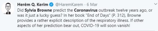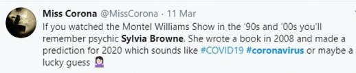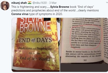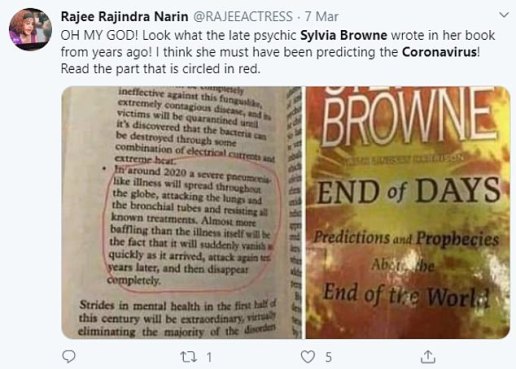Theorists took to social media to draw a connection to the virus from Sylvia’s Browne’s book