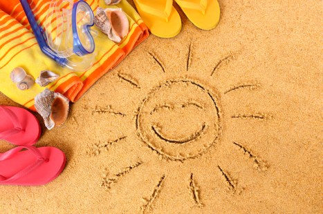 Beach background with sun drawing, towel and flip flops