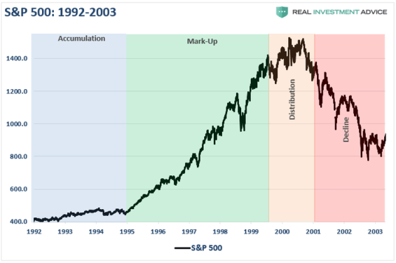 The accumulation phase, following the 1991 recessionary environment, was evident as it preceded the “internet trading boom” and the rise of the “dot.com” bubble from 1995-1999. As I noted previously: