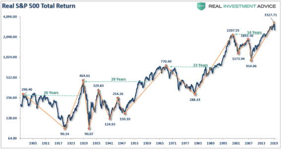 This is the story told by the S&P 500 inflation-adjusted total return index. The chart shows all of the measurement lines for all the previous bull and bear markets, along with the number of years required to get back to even.