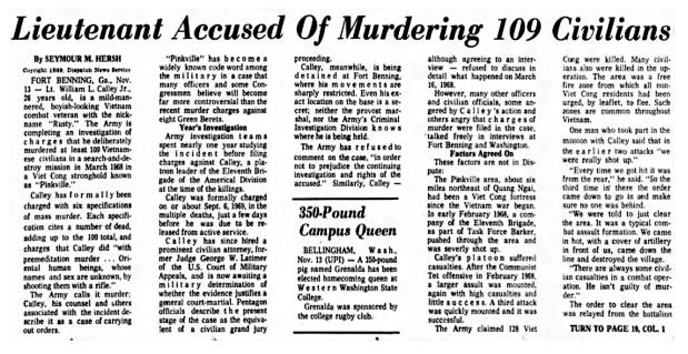 But Calley’s conviction was largely covered up by the military. The New York Times ran only a short Associated Press story on Sept. 7, 1969, with few details. Hersh, however, heard something about the incident from a military source in Washington and started poking around. Eventually he got to see Calley in his cell in Georgia and was even allowed to look through classified notes on his case. Hersh had his story. He pitched it to Look and Life Magazines, but was turned down. Eventually the freelancer published his story at the obscure Dispatch News Service.