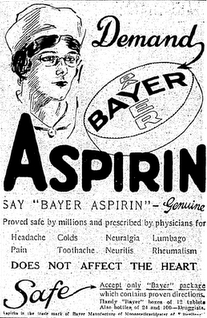 “Farbenfabriken Bayer’s worldwide efforts had left few places lacking aspirin. In the United States, Bayer’s giant factory produced aspirin under “American” management. After Bayer executives were charged with violating the Trading with the Enemies Act in August 1918, advertisements encouraged confidence in aspirin.” Karen Starko