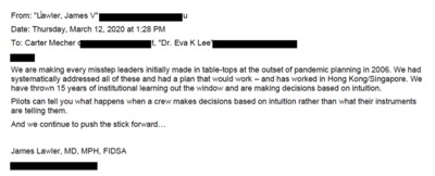 One of the Red Dawn e-mails. Dr. Lawler explicitly refers to the plan developed for President Bush by Drs. Mecher and Hatchett to place the civilian population under house arrest.
