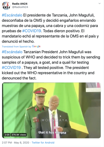 He played what the local press described as “a trick” on the organization: He sent the WHO samples of a goat, a papaya and a quail for testing.