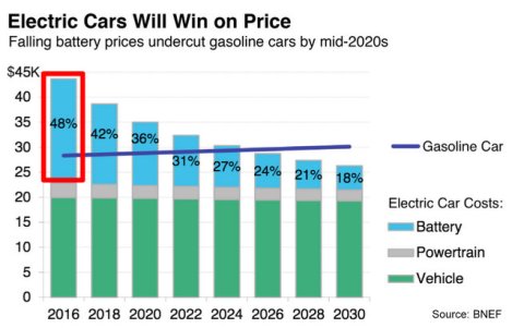 In 2017 BNEF predicted that by 2026 EVs would be cheaper to buy than the average gas car in North America.