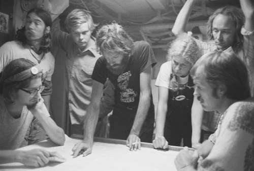 James Bay crew tracks the Soviet whalers; Bob Hunter points out ship movements on the chart with crew. From left: Michael Manoloson, David Garrick (Walrus), Michael Bailey, Bob Hunter, Susi Leger, Paul Spong, Lance Cowan. North Pacific, between Mexico and Hawaii. © Greenpeace / Rex Weyler