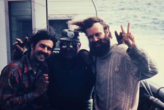 Rex Weyler, John Cormack, and Bob Hunter on board the Phyllis Cormack. © Greenpeace / Ron Precious