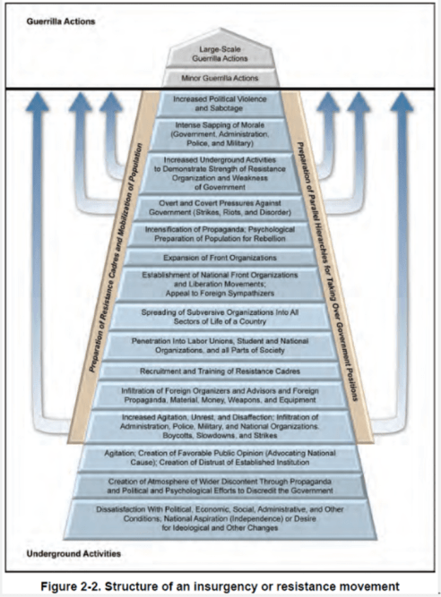 Consider this a pyramid that begins at the bottom and builds to the apex. This all begins with underground activities and the fanning of legitimate flames, like Selco mentioned in his article about defunding the police.