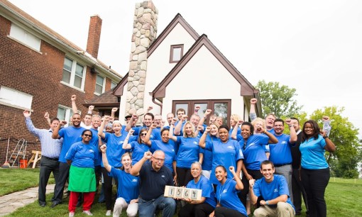 Ford Motor Company Fund President Jim Vella is joined by a team of Ford volunteers at the press unveiling of Tiny Home Detroit’s first completed home. Ford Motor Company Fund is the venture’s largest single donor. Photo by Charlotte Bodak/Ford Motor Company Fund.