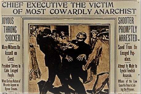 On September 6, 1901 McKinley was shot and mortally injured while visiting the World’s Fair in Buffalo in New York State. He died eight days later. His assassin was a Polish-American former steel worker called Leon Czolgosz who had been taken up by leading figures in the Anarcho-Syndicalist movement led with great prominence and charisma by former Russian Prince Peter Kropotkin from his secure, protected haven in Britain.