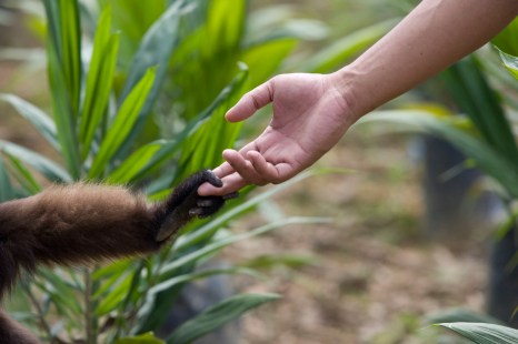 A Borneo langur, in Antan Kalang village, holds the hand of a villager. © Greenpeace / Ardiles Rante