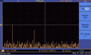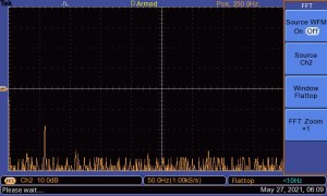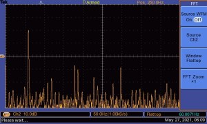 Figure 1, the background frequencies, probe just sitting on the table. Horizontal scale is 50 Hz per division. You can see the 60 Hz mains peak clearly.