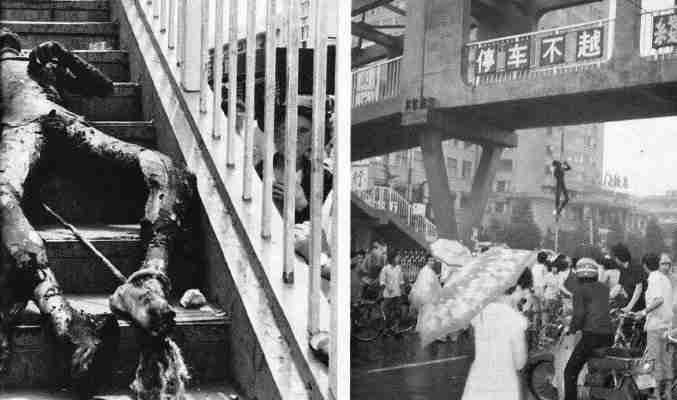 Earnshaw notes how a photo of a Chinese soldier strung up and burned to a crisp was withheld by Reuters. Dramatic Chinese photos of solders incinerated or hung from overpasses have yet to be shown by Western media. Photos of several dead students on a bicycle rack at the barricade are more convincing.