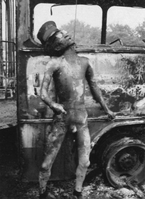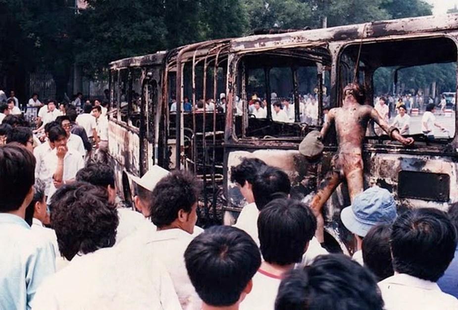 To date the world seems to have assumed that those buses were fired by the crowds after the soldiers had started shooting. In fact it was the reverse — that the crowds attacked the buses as they entered Beijing, incinerating dozens of soldiers inside, and only then did the shooting begin. Here too we do need not go far to find the evidence — in the not publicized photos of soldiers with horrible burns seeking shelter in nearby houses, and reports of charred corpses being strung from overpasses.