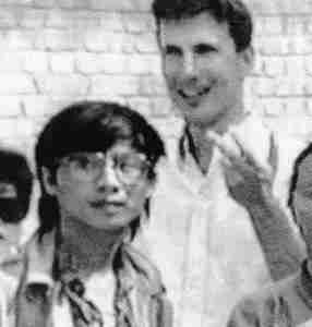 ln violation of the martial law decrees operative in parts of Beijing. John E. Pomfret. an AP correspondent in Beijing, kept frequent contact with the ringleaders, passing on information and providing asylum. The photo shows John E. Pomfret (middle) and Wang Dan (first left) together.