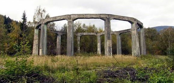 If one follows the old railroad tracks out of Ludwigsdorf and up into the Sudeten’s foothills, they intersect the now abandoned Wenceslas Mine hidden in a valley. At the far end of the valley next to a now crumbling facility that was once capable of burning a thousand tons of coal a day, a thirty meter wide concrete ring is suspended ten meters high by ten concrete pillars. Heavy duty hooks are built into the tops of each of them and on the ground there is a junction for electric cables that were once powered by the coal burning facility. Inside of the ring the ground has been excavated to about a meter and lined with ceramic bricks.