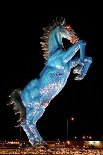 In 1993 New Mexican artist Luis Jimenez was commissioned to build a thirty two foot high statue of a similar stallion rearing up in the middle of the still unfinished Denver International Airport. The airport would open in 1995 but the statue would not be completed until much later. Jimenez was killed in 2006 when a section of the unfinished horse fell from a hoist at his studio in Hondo, New Mexico. His sons would finally finish the horse in 2008. Since then about twenty eight million travelers per year are treated to the spectacle of the rearing horse. It’s most notable feature is its ability to leave lasting impressions of fear and dread in small children. The statue is also known as the ‘Devil Horse’ or ‘Satan’s Steed.’