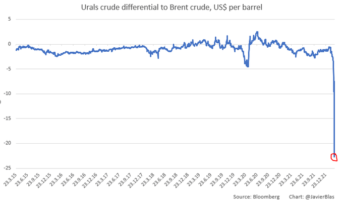 It should be underscored here that Russia is not withholding volumes: highlighting the difficulty for Russian producers to sell their oil, nine cargoes of 100 thousand tons each for March loading failed to find buyers on Wednesday, after two prior attempts failed on Monday and Tuesday – which explains why as shown above, Russian benchmark Urals oil is now being offered at a record $20 discount to international benchmark, with no bids: