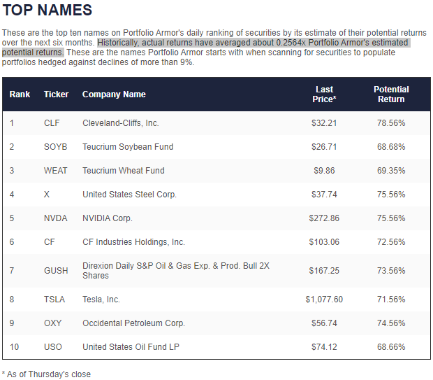 Our top ten then was heavy on industrial commodities, and our top as of Thursday’s close was as well. Aside from our two top tech names, Tesla (TSLA) and Nvidia (NVDA), the rest of the our top ten fit the following categories.