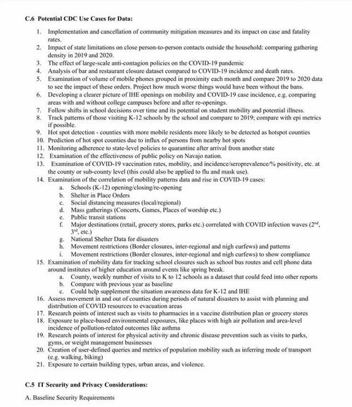 “CDC also plans to use mobility data and services acquired through this acquisition to support non-COVID-19 programmatic areas and public health priorities across the agency, including but not limited to travel to parks and greenspaces, physical activity and mode of travel, and population migration before, during, and after natural disasters,” it reads. “The mobility data obtained under this contract will be available for CDC agency-wide use and will support numerous CDC priorities.”