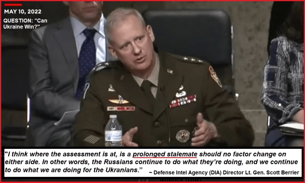 Second, as to the pragmatic question of “to what end?” There was a critical point made last week by Defense Intel Agency (DIA) Director Lt. Gen. Scott Berrier, that not a single media outlet or politician discussed. During his briefing to the Senate Armed Services Committee, Berrier was asked “can Ukraine win” the conflict against Russia?