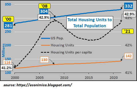 As the per-capita housing chart below shows, the number of housing units per person (per capita) is now at the same level as the previous bubble. This doesn’t support the housing-shortage explanation on a national scale (though local scarcities could be driving prices much higher), and points to a speculative cheap-credit-fueled FOMO frenzy as the primary source of the bubble.