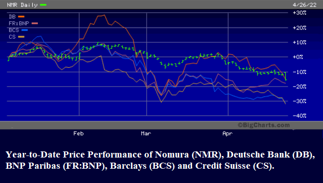 As the two charts below indicate, the same Wall Street banks and their foreign derivative counterparties that the Fed was bailing out in the last quarter of 2019 and the first quarter of 2020 have experienced dramatic deterioration in their share prices year-to-date.