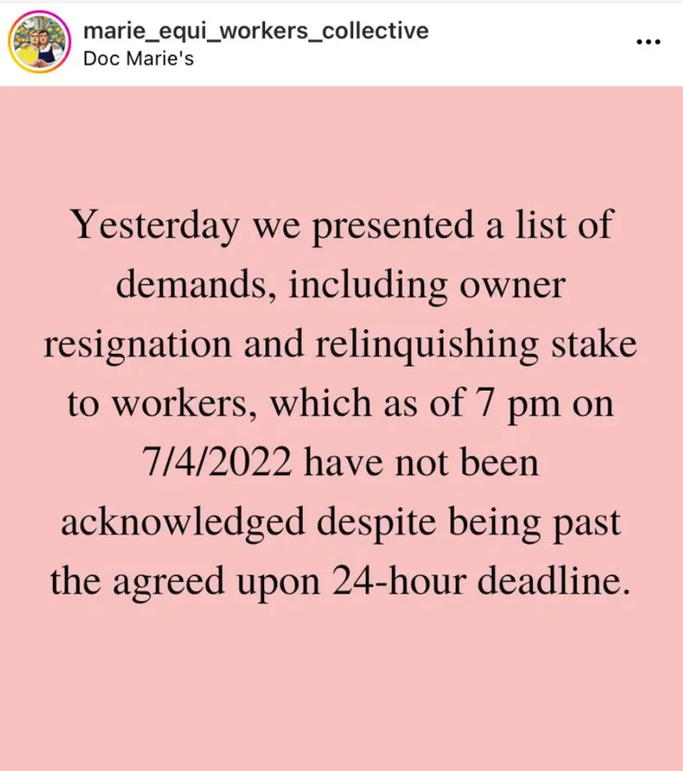 Yes, after being employed for five days. Doc Marie’s was accused of, quote, not being “proactive enough in creating a safe space and accused the owners of racism.” They also, in their list of demands–yes, a list of demands–wanted this small business that has only been open for five days to provide free education to the community.