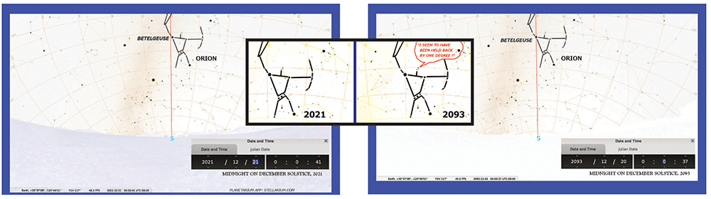 For example, as I write this at the very end of October and beginning of November, the majestic constellation we call Orion is rising above the eastern horizon in the hours after dark, such that the entire constellation clears the hills to the east of where I live about one hour before midnight (see Figure 1). However, as we continue through the year, the stars of the constellation Orion will rise just a little bit earlier each night (about four minutes earlier per night, at the latitude where I live), such that in just a few weeks the entire form of Orion will be above the eastern horizon two hours before midnight, and thus even higher in the sky later on (see Figure 2). In a few months, the constellation will be high in the sky nearing its zenith.