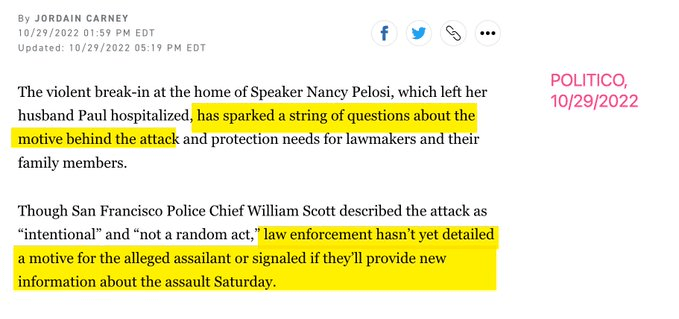 Police investigating the Paul Pelosi attack continue to state they *do not know the motive.* Yet liberal “thought leaders” like@HillaryClinton and @jimmykimmel have decreed that not only is the motive known to them, but only insane or malicious people would question them.