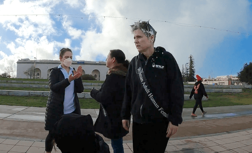 The women, who wore sashes reading “Woman Adult Human Female,” and carried signs saying “No Men In Women’s Prisons” and “Dana Rivers Is A Man,” were also pelted with pies in the video.