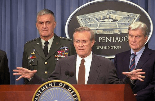 Former Defense Secretary Donald Rumsfeld; U.S. Army General Henry Shelton, chairman, Joint Chief-of-Staff and Senator John Warner (R-VA), at Pentagon press conference. (Jim Watson, USN/Wikimedia Commons)